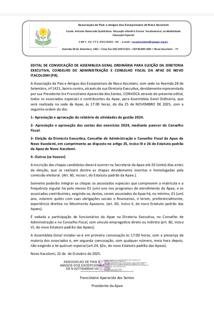 Edital de Convocação de Assembleia Ordinária para Eleição da Diretoria Executiva, Conselho de Administração e Conselho Fiscal da APAE de Novo Itacolomi,Pr.