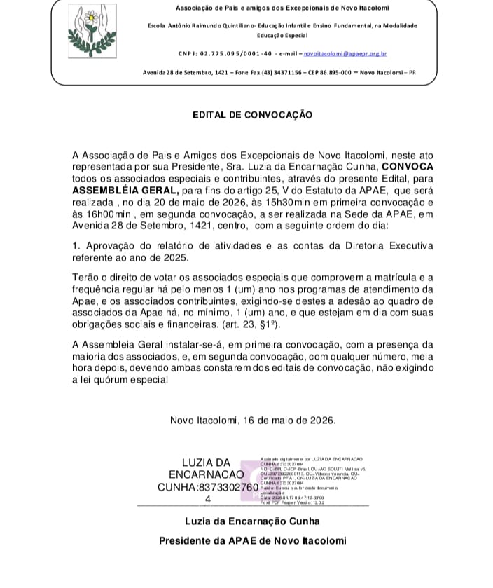 Home » Editaistitle_li=Notíciastitle_li=NOTÍCIAS » EDITAL DE CONVOCAÇÃO EDITAL DE CONVOCAÇÃO Presidente da Apae de Novo Itacolomi, Luzia da Encarnação Cunha convoca Assembleia Geral